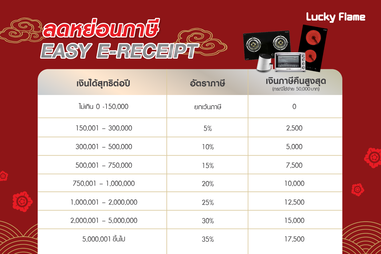 หากตรุษจีนปีนี้ใครที่กำลังมองหาเครื่องครัวดี ๆ ให้กับตัวเองหรือจะมอบแทนใจให้คนที่คุณรัก เรา Lucky Flame ขอเป็นตัวแทนผู้ผลิตเตาแก๊สของคนไทย จุดประกายความสุขให้กับลูกค้าทุก ๆ ท่าน ด้วยการส่งมอบอั่งเปาในรูปแบบของใบกำกับภาษีอิเล็กทรอนิกส์ ที่ลูกค้าสามารถนำไปลดหย่อนภาษีกับโครงการ Easy E-receipt ยิ่งใครเป็นสายชอบทำอาหารมีถูกใจแน่ เมื่อซื้อสินค้าแบรนด์ลัคกี้เฟลม อย่างเตาแก๊สไฟแรงฉลองปีมังกร หรือจะมีเครื่องดูดควันครัวไทยดูดสิ่งชั่วร้ายแก้ปีชง และเครื่องใช้ไฟฟ้าอื่นๆ รุ่นใดก็ได้ ผ่านช่องทางร้านค้าออนไลน์ของทางบริษัท ยิ่งซื้อเยอะยิ่งได้คืนมาก เพราะนำไปลดหย่อนภาษีได้สูงสุด 17,500 บาทเลยนะ