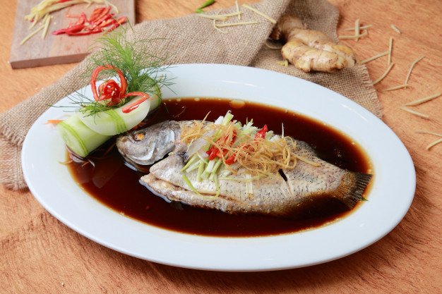 ปลา ในภาษาจีน ออกเสียงเหมือนคำว่า ความเหลือเฟือ เมนูปลาจึงมีความหมายว่าการมีกินมีใช้เหลือเฟือตลอดปี นอกจากนี้ ชาวจีนเชื่อว่าในปลามีเทพสถิตอยู่ การรับประทานปลาในช่วงปีใหม่จะทำให้เทพขับไล่วิญญาณร้ายออกไปจากชีวิต สำหรับวิธีการกินปลา ชาวจีนมีความเชื่อว่า เมนูปลาควรจะเป็นจานสุดท้ายที่เหลือส่วนหัวและหางไว้จนถึงวันขึ้นปีใหม่ ซึ่งเป็นการแสดงออกว่าปีใหม่นี้จะเริ่มต้นและจบลงด้วยความเหลือเฟือ การเสิร์ฟหัวปลาก็ควรหันหัวปลาไปทางที่ผู้อาวุโสนั่ง เป็นตัวแทนของความเคารพ และระหว่างการรับประทานอาหาร ไม่ควรหันหัวปลาไปทางอื่น ปลาสามารถนำมาสร้างสรรค์เมนูได้หลากหลาย ไม่ว่าจะเป็น ปลานึ่งซีอิ๊ว ปลาต้มน้ำซุป เป็นต้น