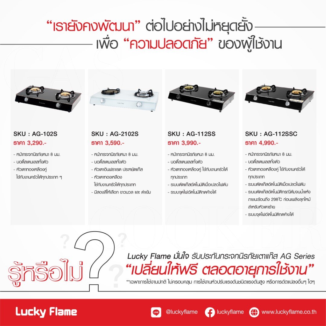 แต่จะปลอดภัยยิ่งขึ้น ด้วยระบบเซฟตี้ ตัดแก๊สอัตโนมัติ เมื่อเปลวไฟดับ หรือ ลืมทิ้งไว้จนน้ำแห้ง ที่เราพัฒนามาเพื่อคนขี้ลืม หมดปัญหาหม้อไหม้ แก๊สรั่ว ปิดไม่สนิท พร้อมรับประกันกระจกนิรภัยเตาแก๊ส AG Series เปลี่ยนให้ฟรี ตลอดอายุการใช้งาน