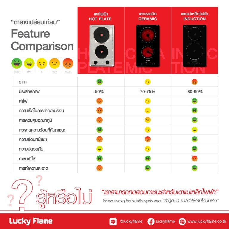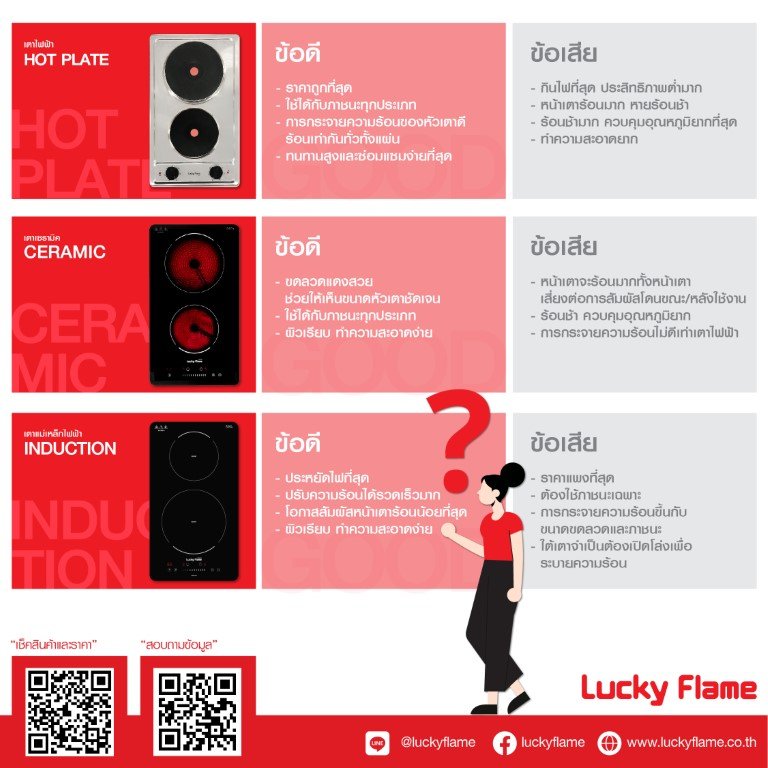 อย่างไรก็ตามในปัจจุบัน เตาไฟฟ้ายังคงมีข้อจำกัดในการปรุงอาหารหลายอย่าง เทียบกับเตาแก๊สที่ใช้งานกันมานานแล้วในครัวไทย เตาไฟฟ้าจึงยังไม่เป็นที่นิยมมากนัก เว้นแต่ชาวคอนโดหรือหอพักที่ไม่อนุญาตให้ใช้แก๊สเพื่อป้องกันอันตราย ทางลัคกี้เฟลมหวังว่าบทความนี้จะช่วยให้ผู้ใช้งานจะเลือกเตาประกอบอาหารได้ตรงใจ ใช้งานแล้วมีความสุขไม่มากก็น้อยนะครับ