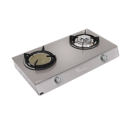 Double-burner tabletop gas stove, model HQ-702S. Made with a full stainless steel body that can handle more weight. Large brass burners provide a strong flame for all types of cooking. Certified with the High-Efficiency Label, Level 5