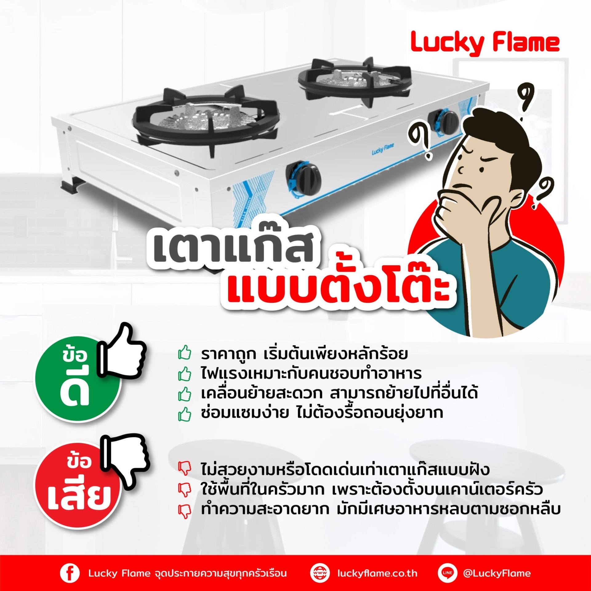 ถ้าเป็นเช่นนั้นแล้ว ระหว่างเตาแก๊สแบบฝังกับเตาแก๊สแบบตั้งโต๊ะอย่างไหนดีกว่ากันล่ะ? วันนี้ Lucky Flame จะมาจุดประกายในประเด็นข้อดี-ข้อเสียของเตาแก๊สทั้ง 2 แบบให้รู้กันไปเลย