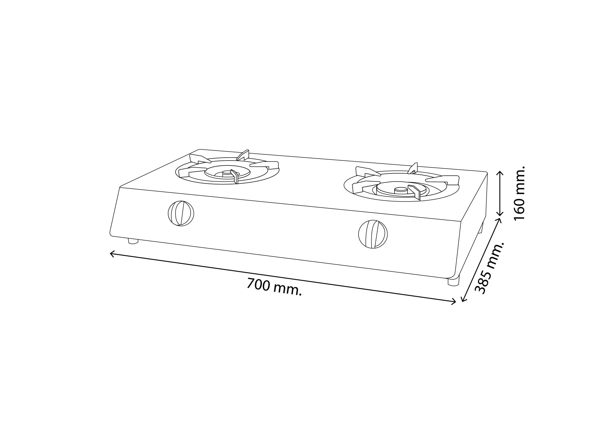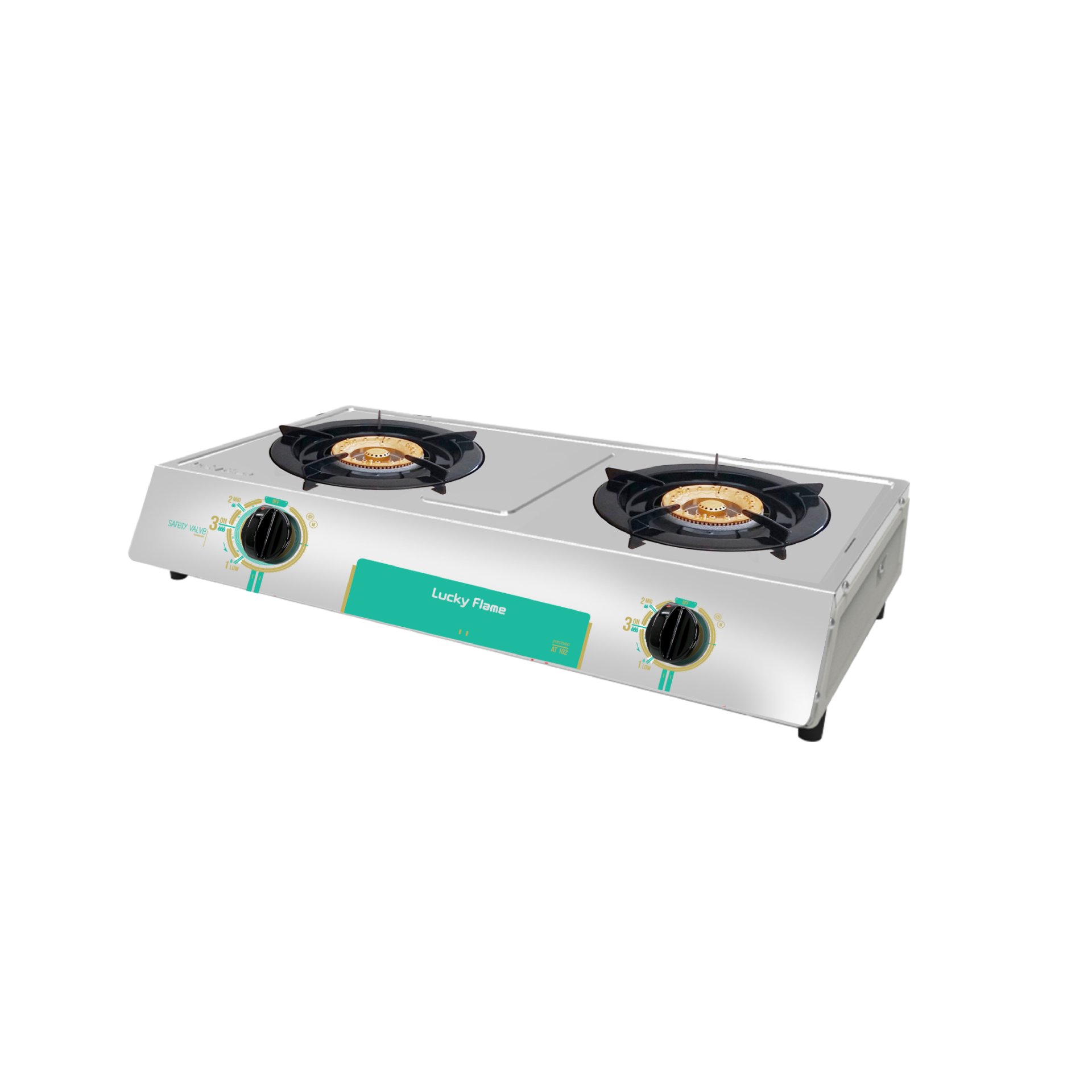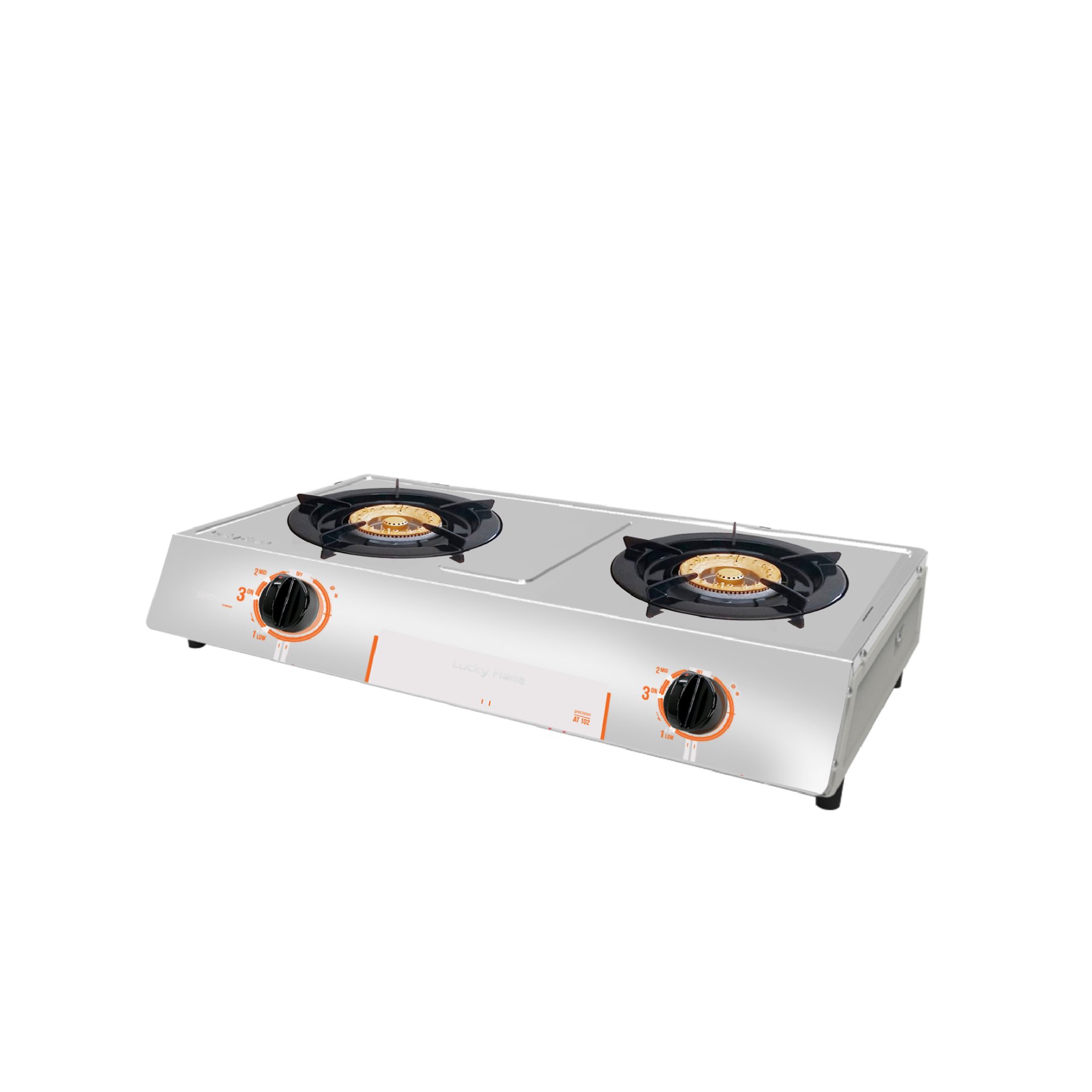 2-Burner Gas Stove Model AT-102 Durable high-power brass burners suitable for all cooking styles. Certified with High-Efficiency Label No. 5.