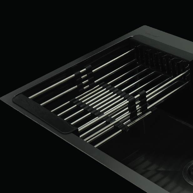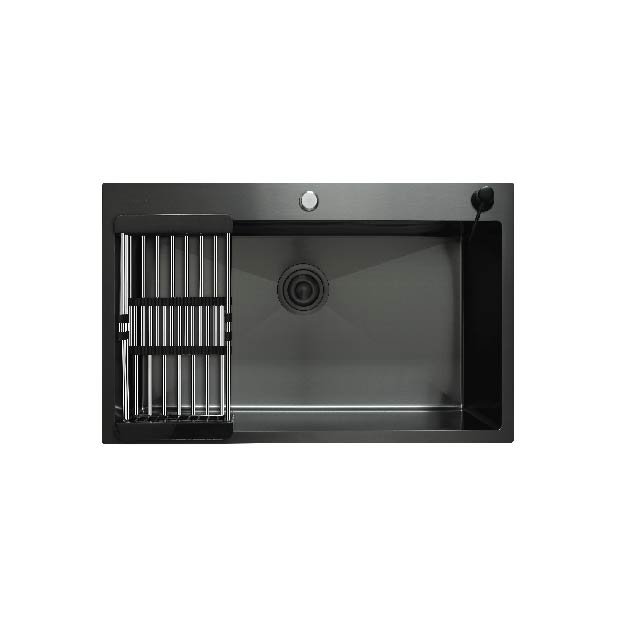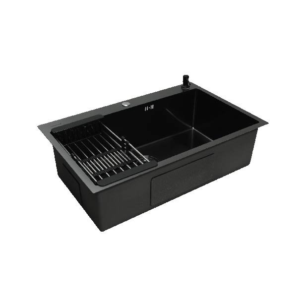 PVD coating sink, 1 bowl, no drainboard, top mount. Made of 0.7mm stainless steel with 6 micron PVD coating. Extra large bowl and drain. Dish rack and soap bottle are included.