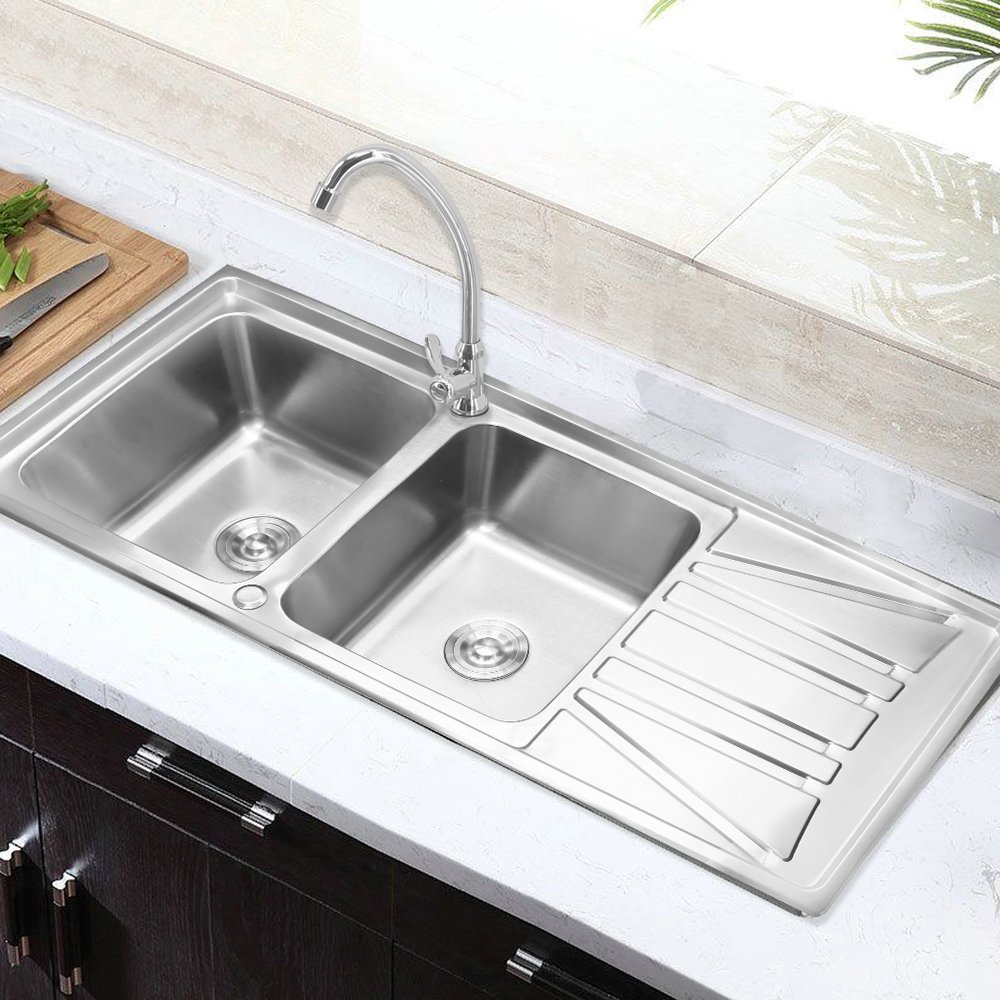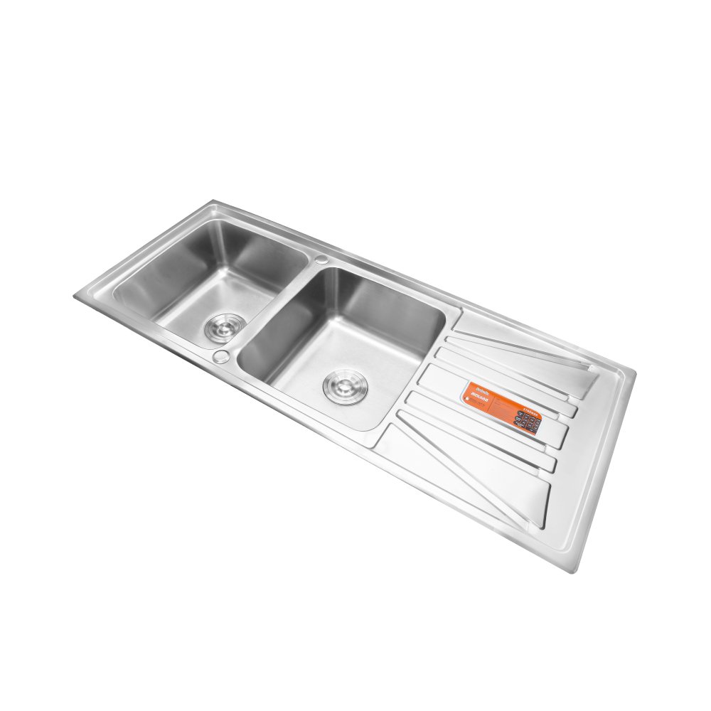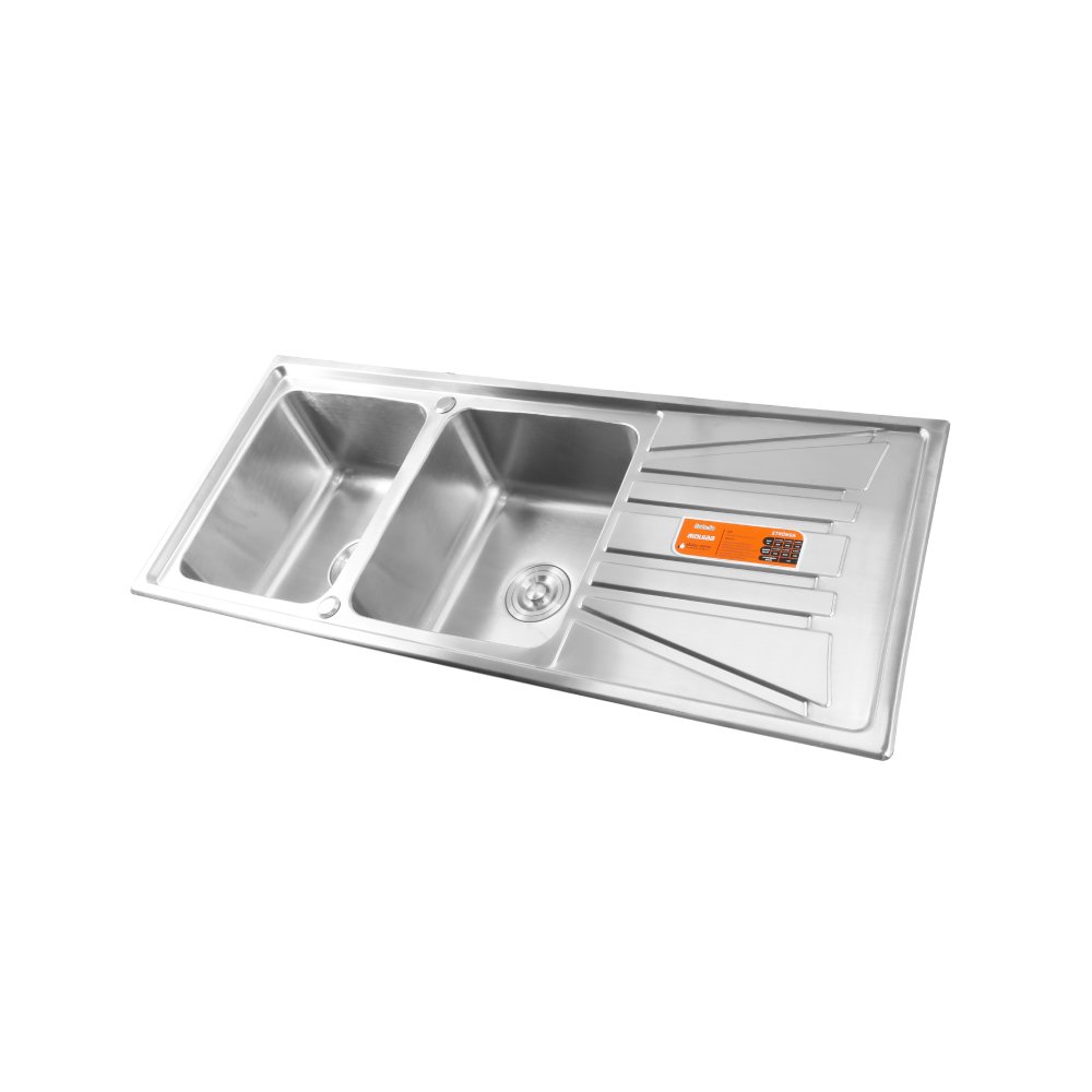 Crafted from premium stainless steel with a durable 0.6 mm thickness, this sink features two spacious bowls for maximum functionality. Designed with an extra-large waste outlet for efficient drainage and a convenient built-in draining board, it combines strength, elegance, and practicality for any modern kitchen.