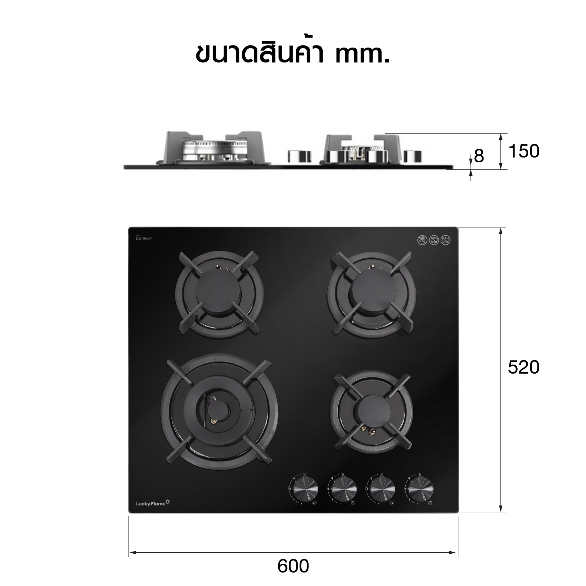 | ด้านหน้าเตาแก๊ส | กระจกนิรภัย Tempered Glass |