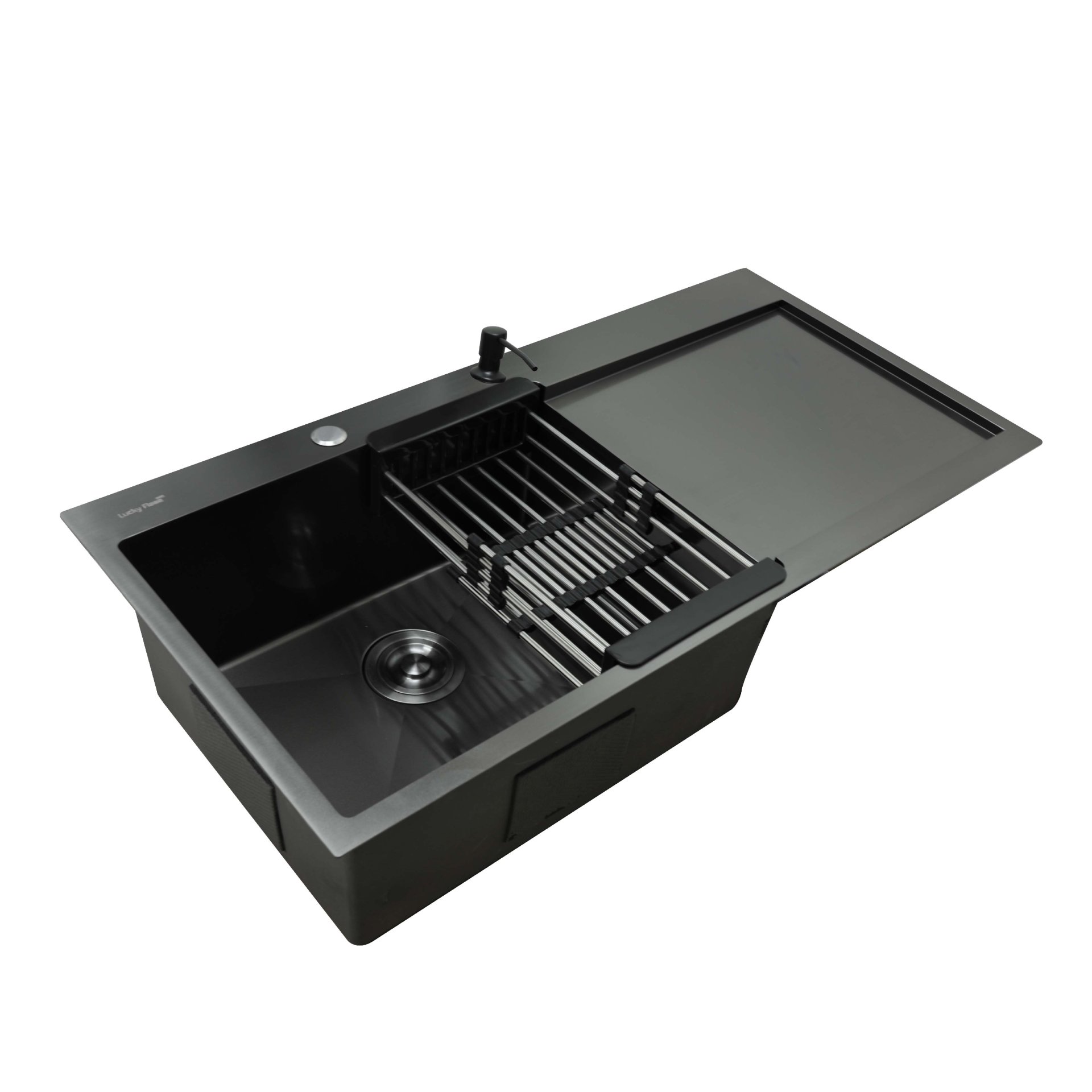 อ่างล้างจานสแตนเลสเคลือบ PVD สีดำ 1 หลุม พร้อมที่พักจาน แบบติดตั้งบนเคาน์เตอร์ Top Mount เคลือบหนาพิเศษ 6 ไมครอนแถมได้หลุมและสะดือใหญ่ พร้อมตะแกรงและที่ใส่สบู่/น้ำยาล้างจาน