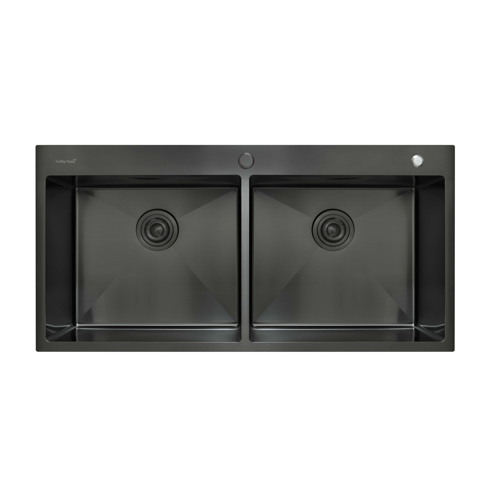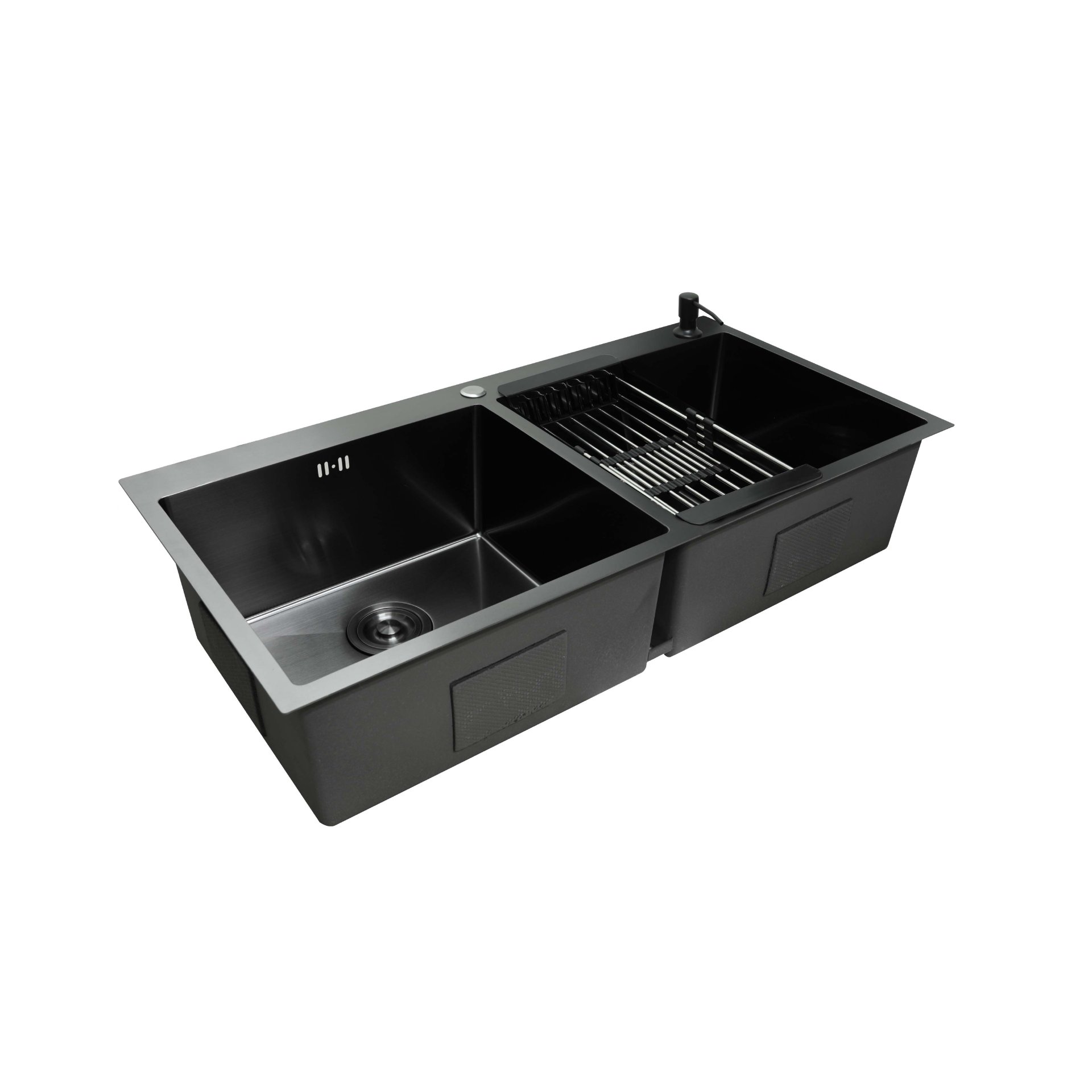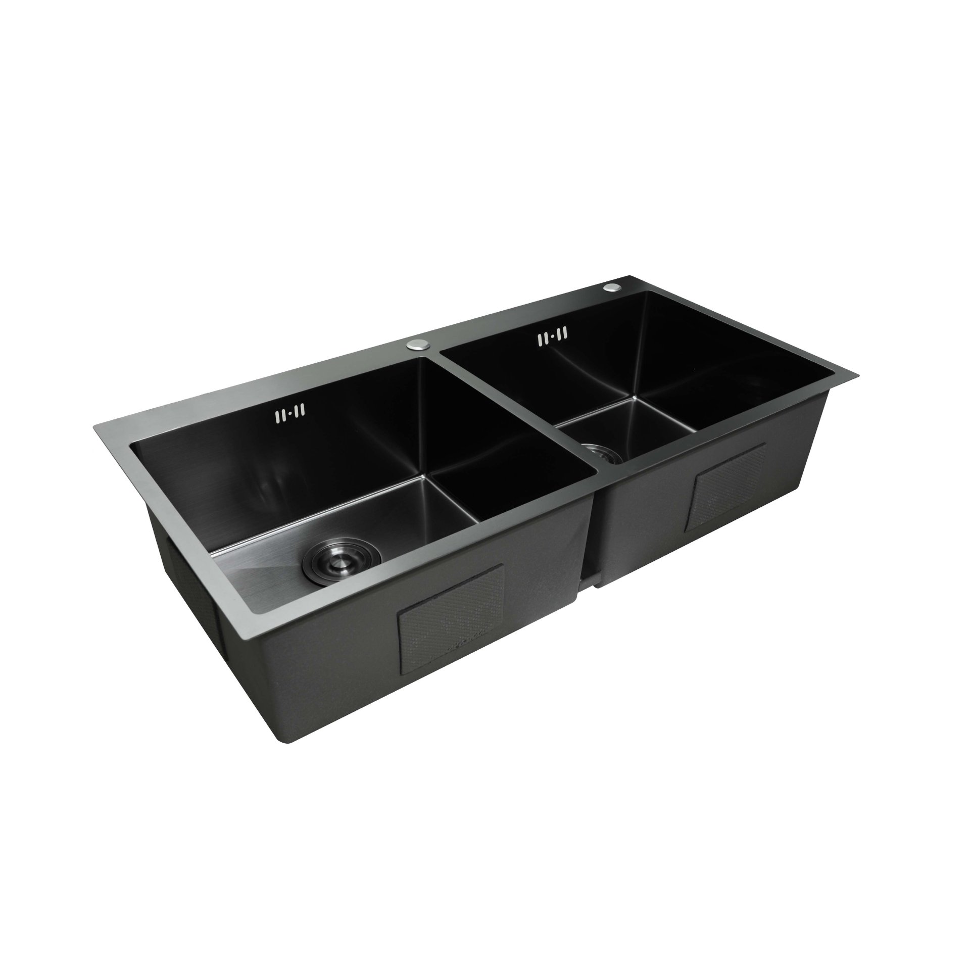 อ่างล้างจานสแตนเลสเคลือบ PVD สีดำ 2 หลุม ไม่มีที่พักจาน แบบติดตั้งบนเคาน์เตอร์ Top Mount เคลือบหนาพิเศษ 6 ไมครอนแถมได้หลุมและสะดือใหญ่ พร้อมตะแกรงและที่ใส่สบู่/น้ำยาล้างจาน