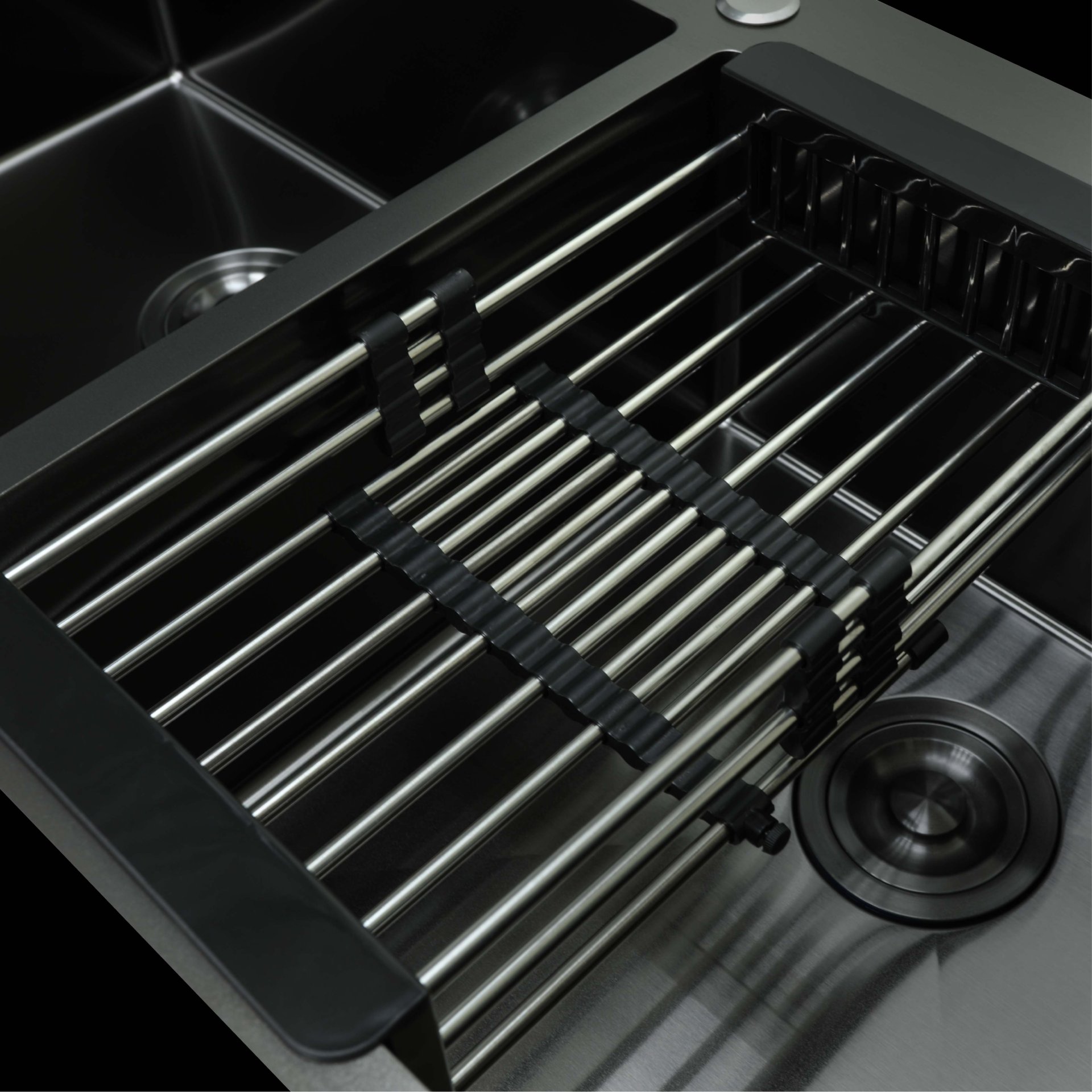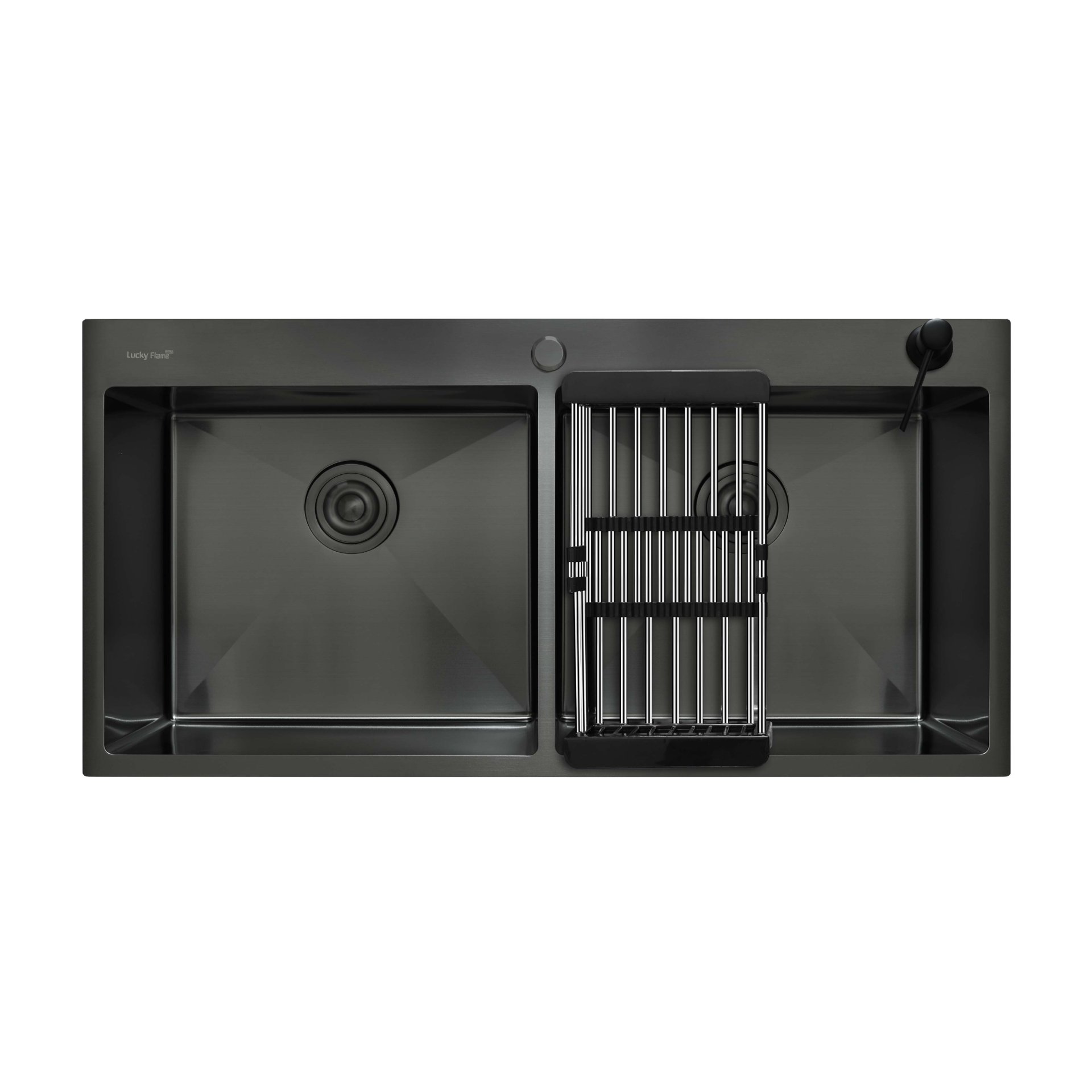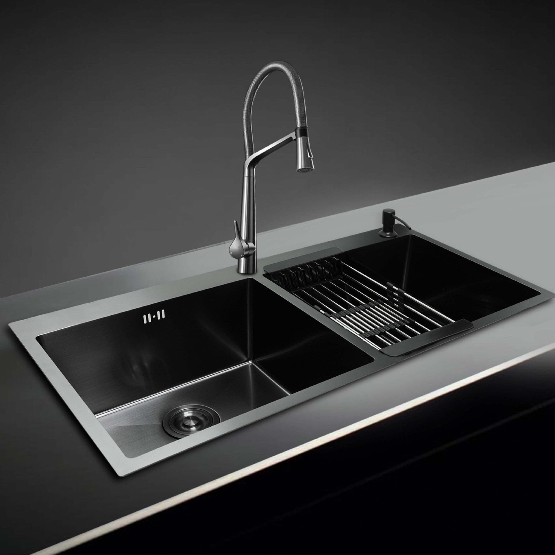 อ่างล้างจานสแตนเลสเคลือบ PVD สีดำ 2 หลุม ไม่มีที่พักจาน แบบติดตั้งบนเคาน์เตอร์ Top Mount เคลือบหนาพิเศษ 6 ไมครอนแถมได้หลุมและสะดือใหญ่ พร้อมตะแกรงและที่ใส่สบู่/น้ำยาล้างจาน